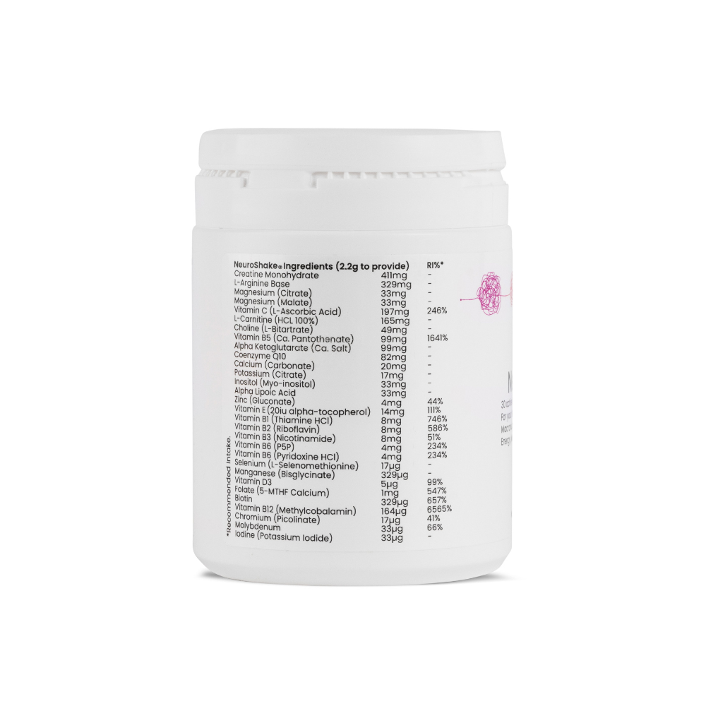 NeuroShake contém 30 vitaminas e minerais altamente potentes, incluindo iodo para auxiliar a função cognitiva normal, biotina para melhorar o metabolismo de macronutrientes e magnésio para a função muscular. As vitaminas B12 e B6 contribuem para o funcionamento normal do sistema nervoso e para a redução do cansaço e da fadiga.